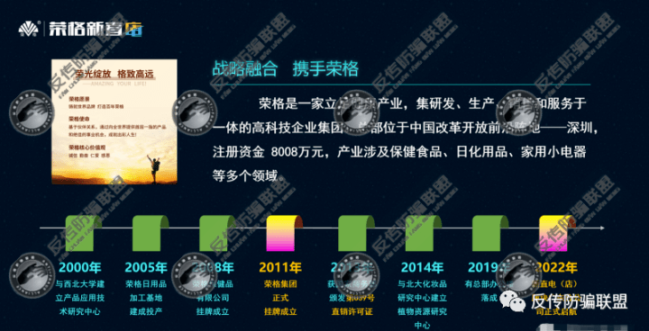 据荣格新直店宣传资料显示,荣格于2013年拿到国家商务部颁发的第039号直销许可证,是一家立足健康产业,集研发、生产、销售和服务于一体的高科技企业集团。总部位于中国改革开放前沿阵地——深圳,注册资金8008万元,产业涉及保健食品、日化用品、家用小电器等多个领域。2022年新直电(店)版块广东分公司正式启航。