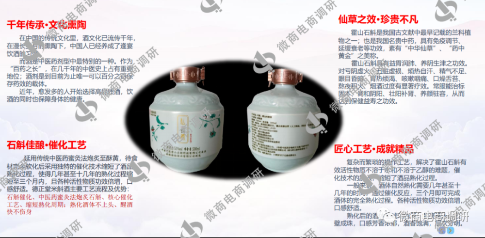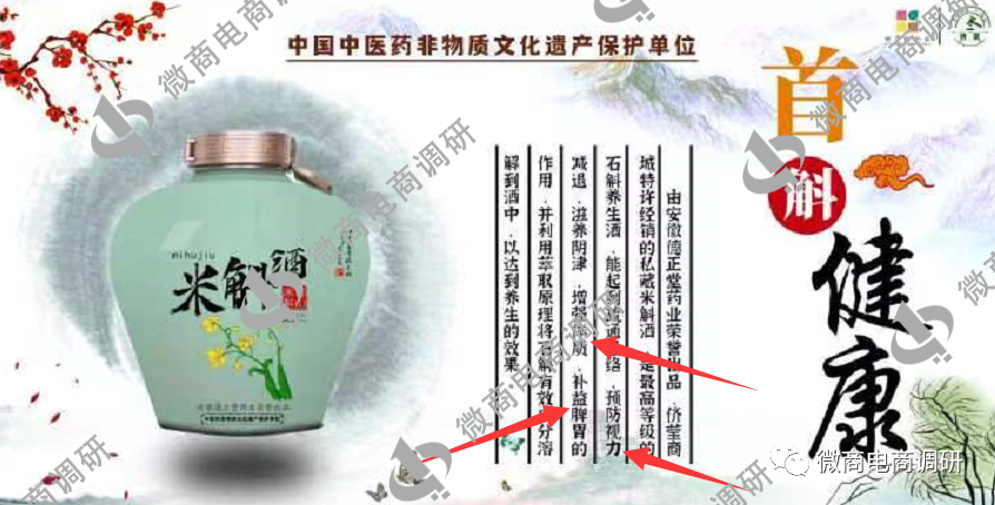 如前文所述,德正堂旗下的米斛酒是该平台的核心产品,在介绍这款产品时,侪莹商城的宣传材料提到了如下段落:霍山石斛是我国古文献中最早记载的兰科植物之一,也是我国名贵中药,具有免疫调节、延缓衰老等功效,素有“中华仙草”、“药中黄金”之美称。霍山石斛具有益胃润肺、养阴生津之功效。对亏阴虚火、五脏虚损、烦热自汗、精气不足、眼目昏暗、胃热烦渴、咳嗽咽痛、口燥舌苔、熬夜积火、烟酒过度有显著疗效。常服能治标固本、调和阴阳、壮阳补肾、养颜驻容,从而达到保健益寿之功效。