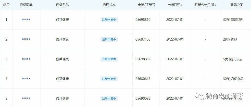 截至目前,该公司所申请的一系列关于“伽莱健康”的商标都还处于“注册申请中”的状态。