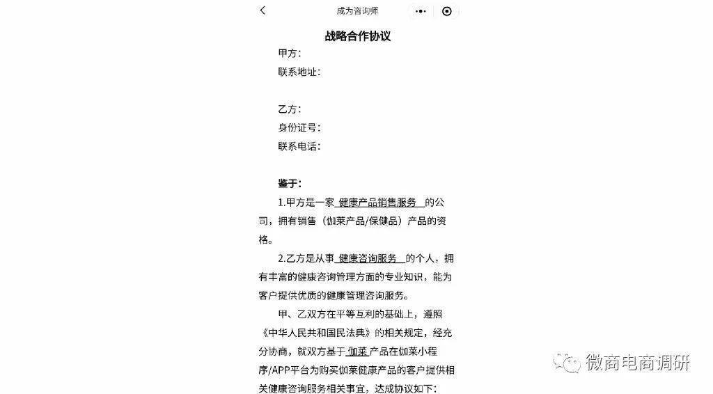 眼下,用户要想申请成为咨询师,还需要在小程序内与公司签订《战略合作协议》。
