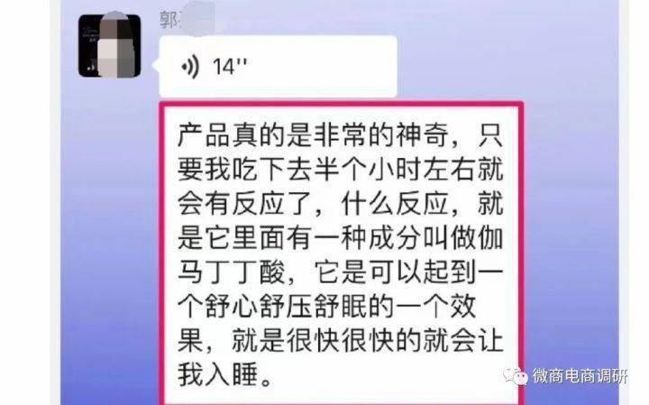 截止2022年8月末,伽莱已经将两款产品推向了市场,一款是具有改善睡眠功效的“甜睡”,另外一款是减脂产品“天婷”。在如今有关伽莱的微信交流群中,甜睡可以说是备受经销商们的推崇。据推广人员阿强(化名)介绍,甜睡是一款100%纯天然的助眠产品,能够让失眠人群在30分钟内轻松入睡,它的作用机理是通过牛奶提取物色氨酸的化学反应,自然产生人体所需要的褪黑素,让人达到入睡效果,同时产品所富含的GABA氨基丁酸可以起到舒心舒压舒眠的作用,还能助力人体真正进入到深度睡眠状态。再得以酸枣仁加持,使甜睡的效果得到了最佳的发挥和释放,从而形成了独一无二的效果。