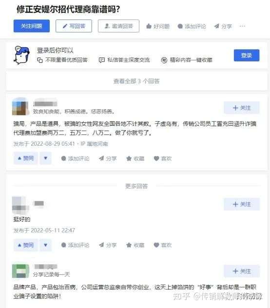 在网上,有不少网友控诉该公司涉嫌传销,知乎上就有网友表示,修正安媞尔就是骗局,传销公司利用产品作为道具诈骗代理费,被骗的女网友不计其数。还有网友表示,产品宣称包治百病,公司运营总监亲自带你创业,如此好事其实就是骗子编设的陷阱。不过对于网友质疑的代理制度是否违规,是否存在诈骗,还需监管部门经调查后认定。