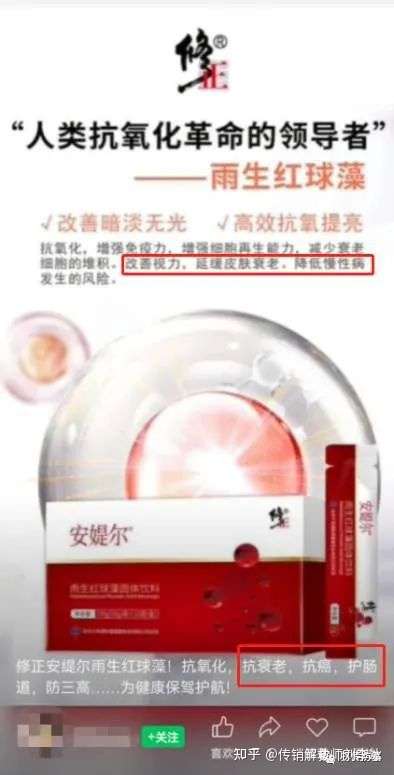 本网注意到,在网上不少代理宣传安媞尔雨生红球藻固体饮料具有各种神奇功效,不仅具有调理肠胃、瘦身塑形,还可提高免疫力与调节三高的作用。甚至还有代理声称具有改善视力、降低慢性病发生的风险,甚至还具有抗癌的功效。