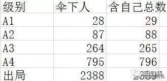 先算多少人可以出局。行业每晋升一级是要把自己三个下线往上拉一级,所以出局就是确保自己的三个下线都是A4老总