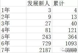 现在仍然按平均每个人1年可以邀约3个人加入,那么我们来算算行业承诺的能赚到1040万大概要多久。行业赚1040是基于最完美发展模式,就是自己三条线下面的每人的三条线都是健康发展的。