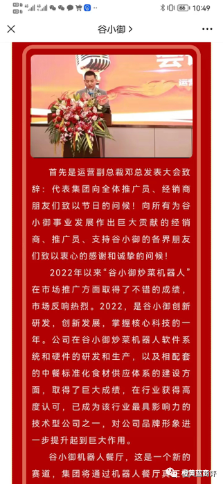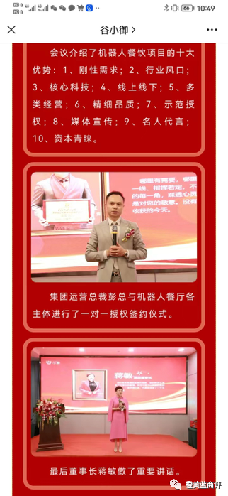 从表面上来看,这家公司与谷瑞城公司并无关系,但实际上还是同一批人在操作。在谷小御公司的微信公众号上,有这么一篇宣传文章《谷小御“机器人餐厅”项目发布》,董事长蒋敏,运营总裁彭总与运营副总裁邓总。