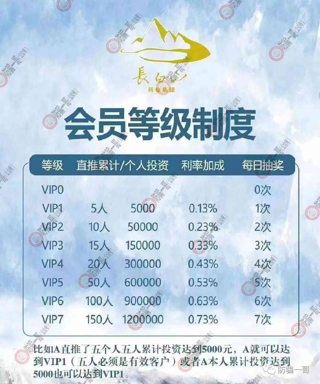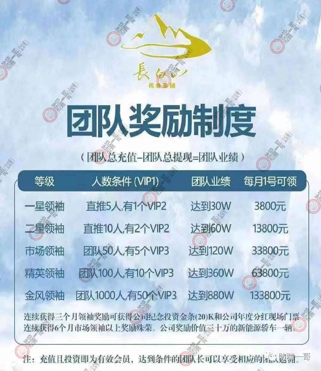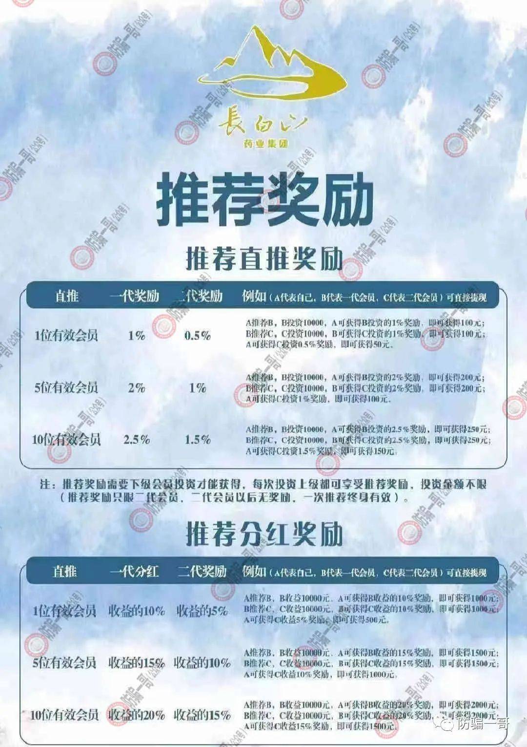 从以上不难发现该 “长白山制药”投资平台静态超高收益 ,该平台为了吸引更多人入坑,对投资人承诺的收益除了高额投资回报外,还可以通过拉人头发展团队及下线的方式收获丰厚的间接收益,采用传销模式进行推广。