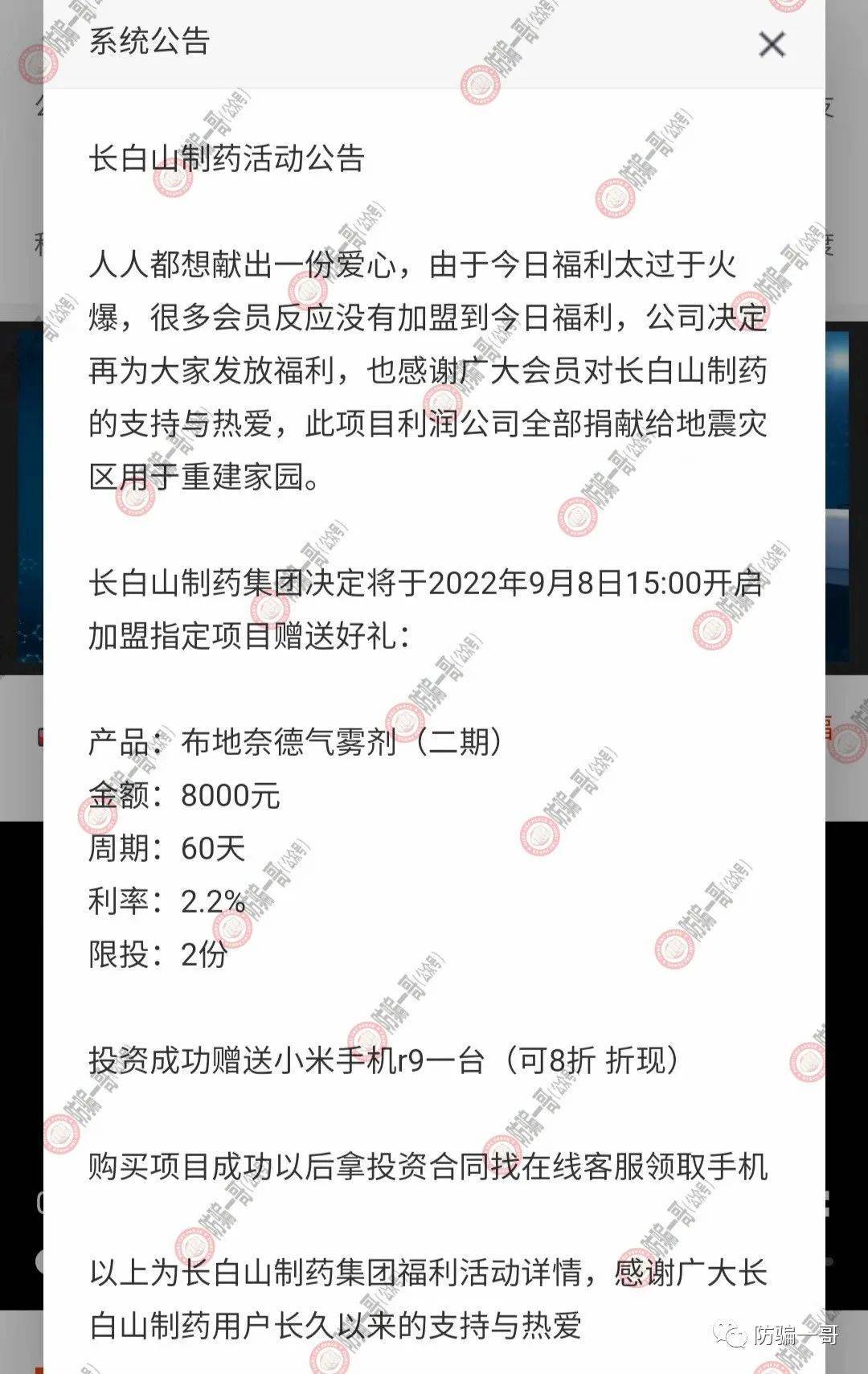 9月7日“长白山制药”APP发了一则做福利活动的公告,诈骗平台做活动不是好事,已经释放出危险信号,骗子准备圈一波要跑路了!