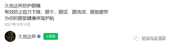 自2021年启动市场以来,久悦达昕商城中的核心产品,一直都是该公司旗下的防光污染镜片,该镜片号称已获得多项专利。关于久悦达昕防护眼镜的功效,在由久悦达昕科技(深圳)有限公司认证的官方视频号中,存在着这样的描述:该产品能够有效防止视力下降、眼干、眼涩、眼流泪、眼部疲劳。在推广人员的口中,这款产品甚至还对一些眼部疾病都能够有所作用。