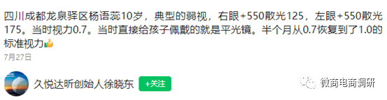 在短视频平台当中,也有相似的宣传,通过佩戴久悦达昕的眼镜,有人的视力从0.6提升到1.2: