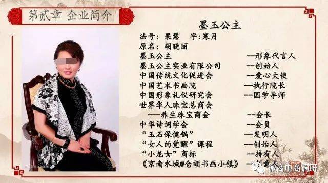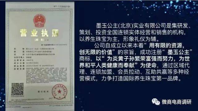 据宣传资料,墨玉公主(北京)生物技术有限公司是一家集研发、生产、销售、投资全国品牌连锁实体店的机构,在北京、苏州、商丘等地成立连锁机构品牌及高端珠宝商务会所。以养生珠宝为根本,国学易理文化为推动,布局大健康产业、电商平台、品牌餐饮连锁、文化旅游小镇等。