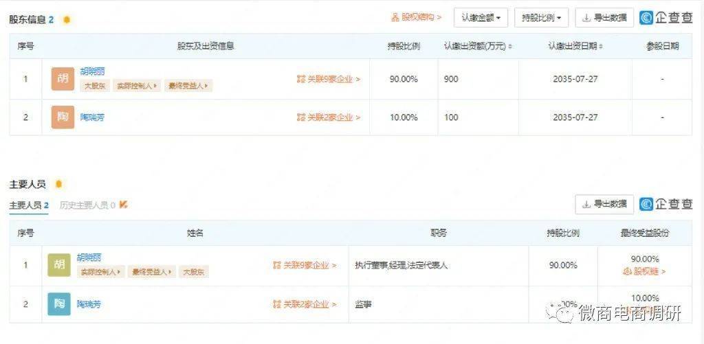 企查查APP显示,墨玉公主(北京)生物科技有限公司成立于2015年7月29日,注册地位于北京市通州区潞城镇胡郎路80号823室,注册资本为1000万元,实缴资本为0,法定代表人为胡晓丽。该公司由胡晓丽控股90%并担任执行董事兼总经理,陶瑞芳持股10%并担任监事。胡晓丽是该公司的实际控制人和最终受益人,同时也是墨玉公主的创始人。