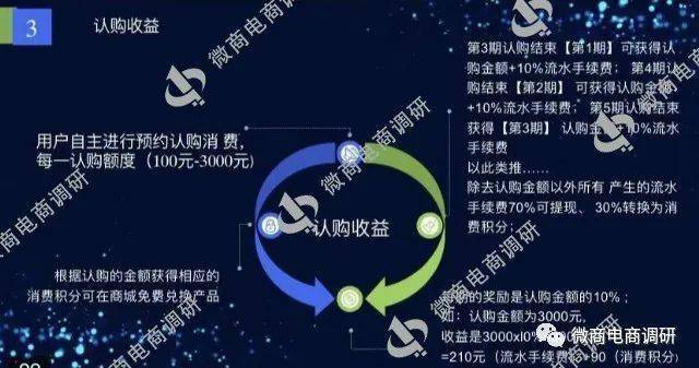 参与认购需要自己往账户余额充值,才可以参与抢购,抢购金额在100~3000元之间,每期的抢购时效为36小时,七天为一周期。第八天返还认购金额+10%的手续费,其中70%可以提现,30%为消费积分,用于积分商城兑换商品。第3期认购结束后发放第1期的奖励,第4期认购结束发放第2期的奖励,以此类推。当最后一期未抢购满时,系统自动重开结算,该期全额退回,还可以获得幸运金红包,倒数两期获得70%手续费补贴+100%盛世玉宠积分+30%文票+优先权,重开结算后,可再从第1期重新开始消费抢购,循环抢购。