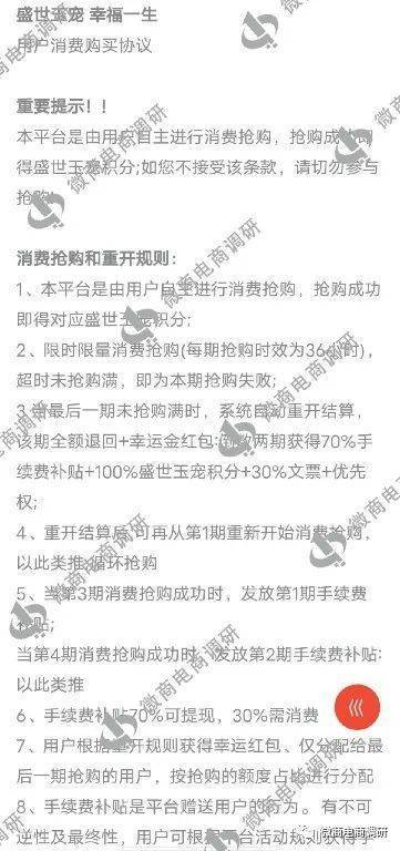 盛世玉宠看似只需要参与认购就可以获得收益,还能免费兑换产品,但其本质就是一个资金盘。以奖励引诱投资者们不断推广发展人员,用后加入者抢单认购的资金给付先加入者的认购奖励,随时都有崩盘的危险,一旦新加入者减少或没有新人加入,项目方就会以各种理由限制投资者提现,最后卷款跑路。微商电商调研也在此提醒大家,远离来路不明的投资项目,不要轻信他人话术,以免受骗。