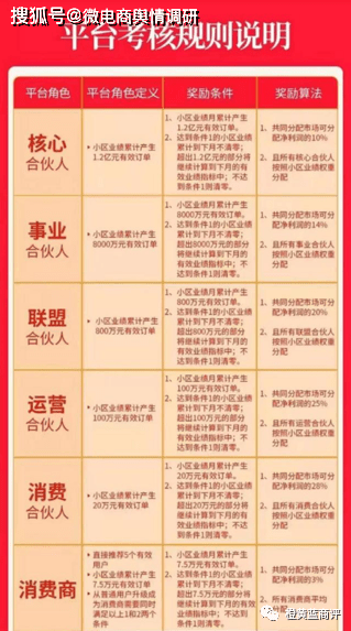 其中合伙人分为消费合伙人、运营合伙人、联盟合伙人、事业合伙人、核心合伙人。小区业绩累计产生20万元有效订单,升级为消费合伙人,然后可以获得分红奖励(共同分配市场可分配净利润的28%),且所有消费合伙人按照小区业绩权重分配;小区业绩累计产生100万元有效订单,升级为运营合伙人,可分配25%的净利润;小区业绩累计产生800万元有效订单,升级为联盟合伙人,可分配20%的净利润;小区业绩累计产生8000万元有效订单,升级为事业合伙人,可分配14%的净利润;小区业绩累计产生1.2亿元有效订单,升级为核心合伙人,可分配10%的净利润。