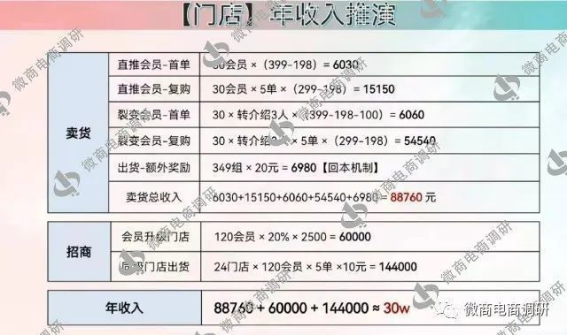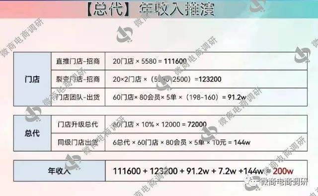 如图所示,“门店有机会年入30万,总代有机会年入200万”的说法由此而来。