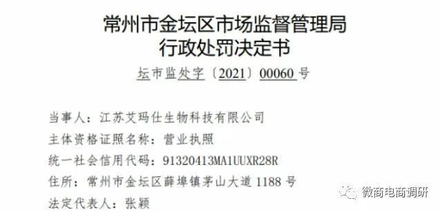 虚假宣传,已遭处罚在刚刚过去的2021年,艾玛仕公司就曾收到过常州市金坛区市场监督管理局开出的罚单,决定书文号:坛市监处字﹝2021﹞00060号。据相关行政处罚决定书显示,接常州市市场监管投诉举报单,称当事人(江苏艾玛仕生物科技有限公司)在公众号上对其产品“胎盘蛋白面膜”进行“加速细胞修复、提高细胞活性、开启肌肤自生态修整网络、激活新生、修复焕活是基础,迈出抗老第一步”宣传。2021年1月28日,常州市金坛区市场监督管理局执法人员赴艾玛仕公司进行现场检查,遂于次日立案调查。