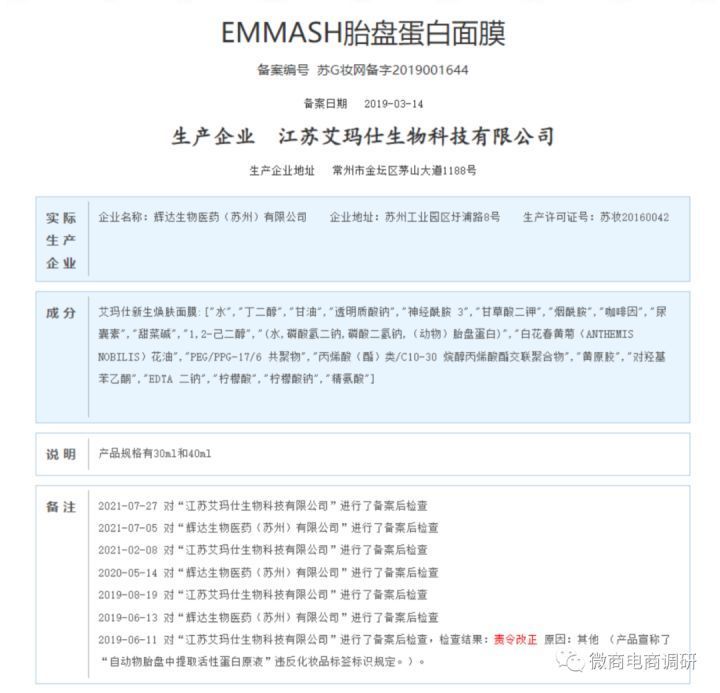 调查发现,该产品全称为“EMMASH胎盘蛋白面膜”,备案编号为苏G妆网备字2019001644,属于国产非特殊用途化妆品,并且在2019年,该产品还曾因“产品宣称了自动物胎盘中提取活性蛋白原液违反化妆品标签标识规定”而遭到过责令改正。而在产品成分表中,也并无有关EGF或人寡肽-1的成分,显而易见,上述宣传涉嫌虚假宣传。