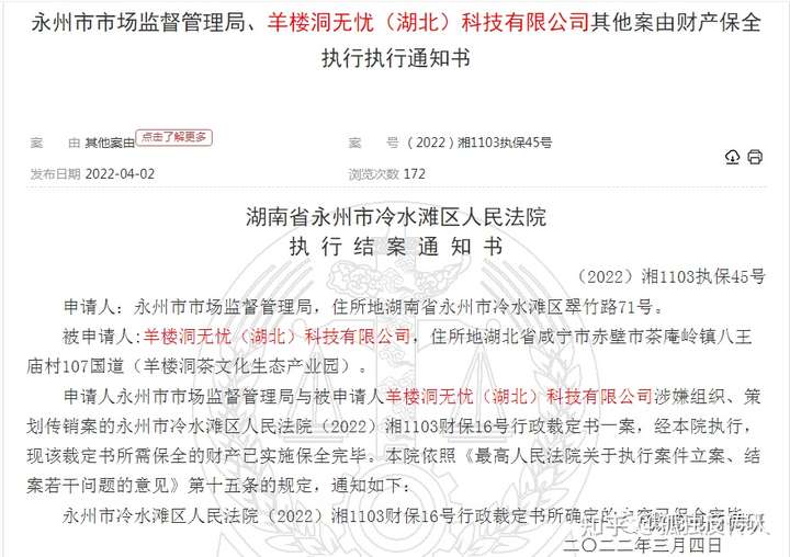 4月2日,中国裁判文书网发布《永州市市场监督管理局、羊楼洞无忧(湖北)科技有限公司其他案由财产保全执行执行通知书》。《通知书》显示,申请人永州市市场监督管理局与被申请人羊楼洞无忧(湖北)科技有限公司涉嫌组织、策划传销案的永州市冷水滩区人民法院(2022)湘1103财保16号行政裁定书一案,经本院执行,现该裁定书所需保全的财产已实施保全完毕。