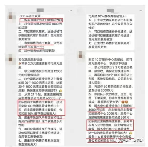 如上图所示,云仓酒庄要求消费者购买不同金额的产品获取不同等级的代理资格,变相收取“入门费”;还设置了500~10000元的推荐奖励,引诱代理推广发展人员获取利益,明显涉嫌“拉人头”;设置团队管理费,以团队成员推广发展人员的数据为依据获取团队分润,团队长还享受团队所有下级的极差收益。这种“入门费”、“拉人头”、“层层分润”的代理模式明显与现行法律法规相违背。