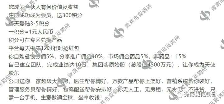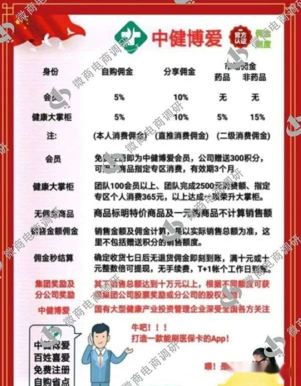 而在《从大掌柜到云小铺,如今的“中健博爱”与昔日的“中盛博爱”有何不同?》一文中,曾披露过中健博爱的奖金制度。据其推广人介绍,中健博爱掌上药房是一个创客平台,业务包含医生、医院、药房、超市、药品、保健品、医疗器械等,所有功能、商品以创客的理念,分享即得相应的奖励,让推广者赚钱,让消费者省钱,用户首次购物即送三百积分。