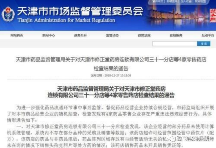 2018年7月27日,天津市药品监督管理局发布《关于对天津市修正堂药房连锁有限公司三十一分店等4家零售药店检查结果的通告》称,天津市药监局组织开展了对该市药品经营企业的随机抽查,检查发现有4家药品零售企业存在严重违法违规经营行为,其中就包括博爱医药连锁微山路店。