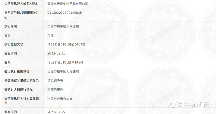 近日,微商电商调研从信用中国网站上了解到,天津市博爱生物药业有限公司被列入了失信被执行人,执行法院为天津市和平区人民法院,行为具体情形为违法财产报告制度。