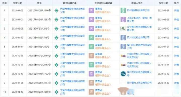 信用中国网站显示,除了文章开头提到的失信被执行人信息外,博爱生物药业还有另外6条失信被执行人记录。而在2020年4月至2021年4月,博爱生物药业共收到10则限制消费令,夏雪城为关联限制消费对象。
