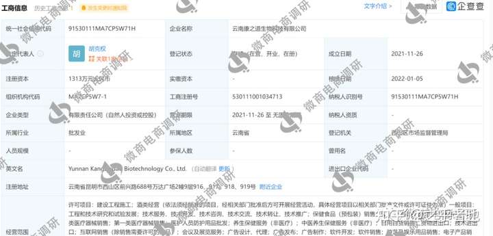 深入了解得知,柜客线下布局的国药医养馆主要从事国药医养诊疗联盟和国药医养精准健康管理项目的运营工作。据介绍,云南康之道生物科技有限公司是负责国药医养馆全国落地的运营中心。企查查APP显示,云南康之道生物科技有限公司成立于2021年11月26日,法定代表人、大股东胡克权,公司位于昆明市西山区万达广场9楼。