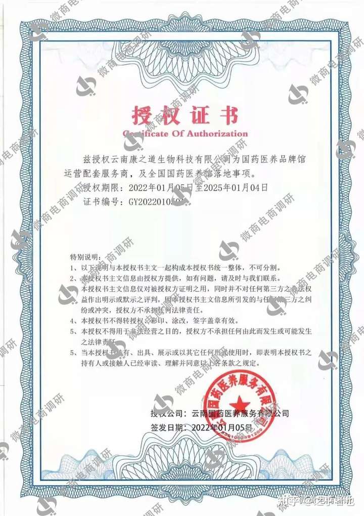 代理商介绍,在2022年1月5日,国药集团授权云南康之道生物科技有限公司作为国药医养品牌馆的运营服务商,可以在全国运营国药医养馆的落地事项。随后,这名代理还发来了盖有云南国药医养服务有限公司公章的授权证书。