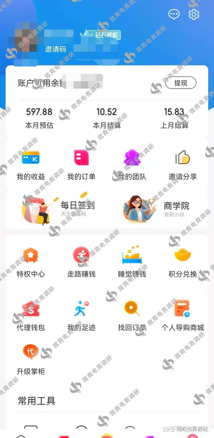 具体而言,柜客像是一个省钱APP,通过技术手段把淘宝、京东等平台上的商家做活动的优惠券汇总,在柜客平台推送给消费者,让用户先领券再下单,达到省钱目的。另外,柜客APP还设置了佣金记录查看功能,每个掌柜自己下单和推广注册自己体系内的消费者下单,每笔利润分红(既佣金)都会详细的记录在“我的订单”里。柜客另外的一个特色功能就是邀请码锁客功能,柜客平台实行邀请码注册制度,每个掌柜邀请码可以注册100个消费用户,每个消费用户也可以用他自己的邀请码分享注册100个消费用户,让掌柜建立起管道收益,代理们称这个是“一次推广、终身受益”。