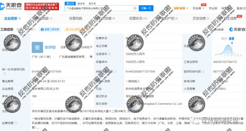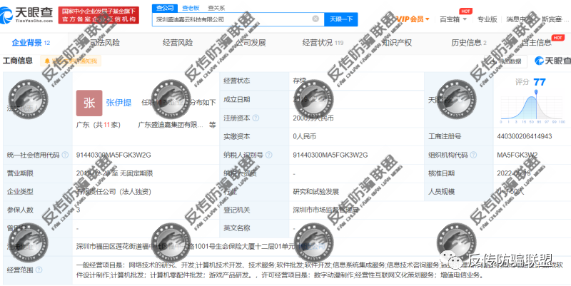 据天眼查显示,深圳盛迪嘉云科技有限公司由广东盛迪嘉电子商务股份有限公司全资控股,广东盛迪嘉电子商务公司注册与实缴均是1亿,法人代表也是张伊提。据推广员介绍,其母公司盛迪嘉集团成立于2006年,总部位于深圳,注册资本2.6亿元。