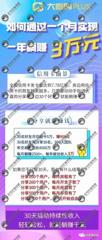 据大嘉购PLUS平台官方微信公众号介绍,在大嘉购PLUS平台只要分享就能赚钱,分享30名好友且月均刷卡5万就能赚900元,如果30名好友再分享30名,达到900人的团队后年交易量可轻松达到4500万,每月躺赚2500多元,每年被动收入3万,分享的越多赚的也就越多,甚至能“30天撬动持续性收入,轻轻松松,就能躺赚千元”。