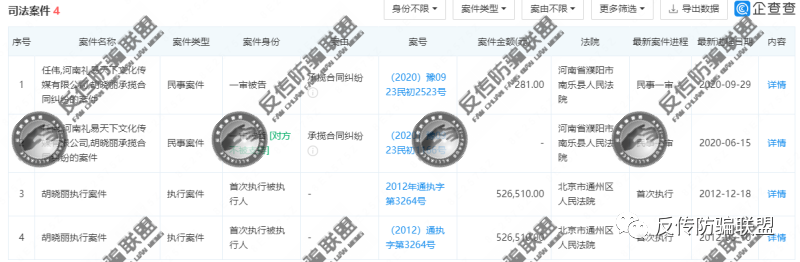 除此以外,据企查查风险提示,胡晓丽涉及的司法案件还有4起。