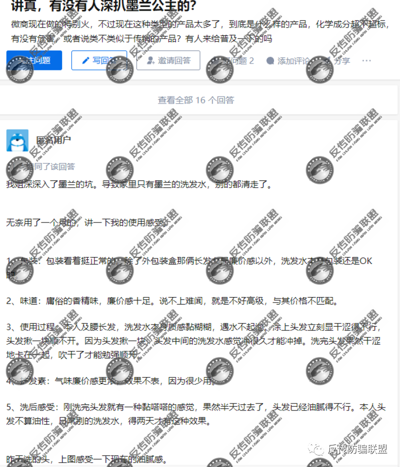 反传防骗联盟还关注到,知乎上有网友发帖咨询墨兰公主产品的真实性的帖子,底下就有人留言说“除了墨兰洗发水,其余的产品都已经清理走了”,廉价、效果不好是对其产品的形容。
