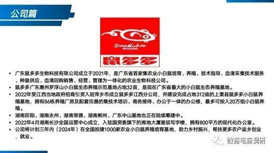 据宣传资料,广东鼠多多生物科技有限公司是一家农业小白鼠培育、养殖、技术指导、血清采集技术服务、种鼠供应、血清回购销售、经营、管理为一体的农业生物科技公司。据宣传,该公司拥有广东惠州罗浮山32亩小白鼠生态养殖示范基地和江西萍乡上栗县313亩的鼠多多小白鼠养殖基地,邵阳养殖基地正在筹建中,并计划三年内(2024年)在全国投建1000家农业小白鼠养殖培育基地。