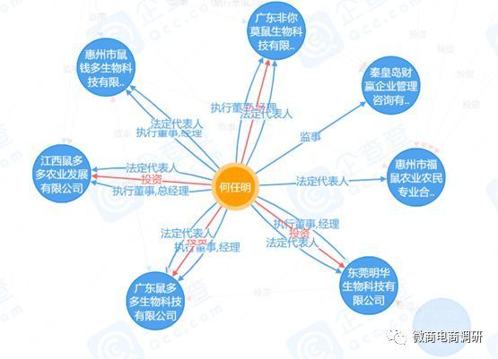 据企查查显示,何任明共与7家企业有关联。他不仅是广东鼠多多生物科技有限公司的董事长,还对外投资了江西鼠多多农业发展有限公司,控股82%并担任法定代表人、执行董事兼总经理;投资了广东非你莫鼠生物科技有限公司,控股100%并担任法定代表人、执行董事兼总经理;投资了东莞明华生物科技有限公司,控股62%并担任法定代表人、执行董事兼总经理;还担任了惠州市福鼠农业农民专业合作社和秦皇岛财赢企业管理咨询有限公司(该公司已注销)监事,以及惠州市鼠钱多生物科技有限公司法定代表人、执行董事兼总经理。其中4家企业是由何任明投资控股,而何任明投资成立多家公司的目的就是要立足小白鼠养殖产业,逐步推进血清产业、血清冻干粉产业、种鼠孵化产业、科研实验鼠产业、冻鼠饲料产业和小白鼠饲料产业六个产业链的建设。