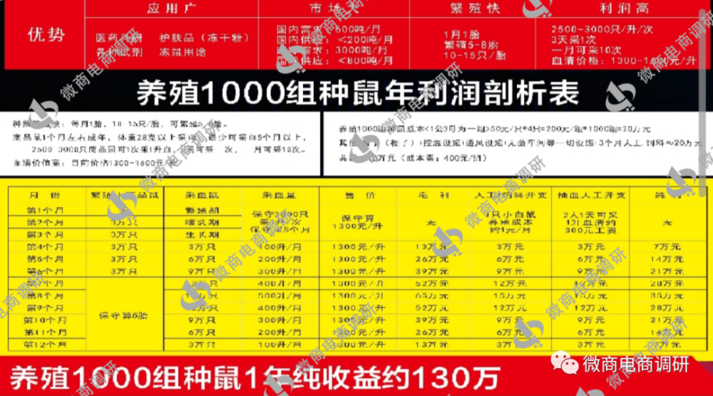 据鼠多多宣传,鼠多多公司的种鼠繁殖极快,每月1胎,每胎繁殖10~15只,一共可以繁殖5~8胎。商品鼠一个月左右成年,体重达到28克以上即可采血,最少可采血5个月。一次性采集2500~3000只小白鼠可得到1升血,三天即可采一次血,一个月可采10次。而小白鼠血清价格较高,目前每升血清的市场价在1300元~1600元。“鼠多多”还称小白鼠血清市场极大,国内每个月小白鼠的血清需求为600吨左右,但国内血清每个月的产出不到200吨,国际上每个月的血清需求约为3000吨,而国际上的血清供应每个月不到800吨。以养殖1000组小白鼠为例(一公三母为1组),种鼠、场地、人工、饲料等成本一共需要40万元左右,前三个月是小白鼠的繁殖期、哺乳期和生长期,第四个月即可拥有3万只采血鼠,一个月最少可采100升血,按1300元/升计算,保守估计可获得13万元毛利,第五个月采血鼠数量即可达到6万只、第六个月9万只、第七个月12万只……一年下来毛利润最低也有325万元,除去期间的养殖成本和人工、饲料等开支,一年的纯利润可达130万元。