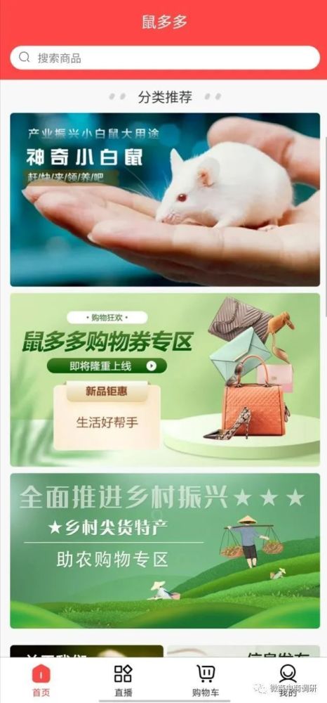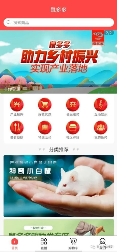 通过推荐人分享的二维码可下载鼠多多APP,APP上有领养小白鼠、购物券专区和助农购物专区。领养小白鼠专区可进行小白鼠认养,1公3母为1组,1组400元,5组起认养;购物券专区可用购物券积分抵扣购买产品;助农购物专区内售卖各种农产品。