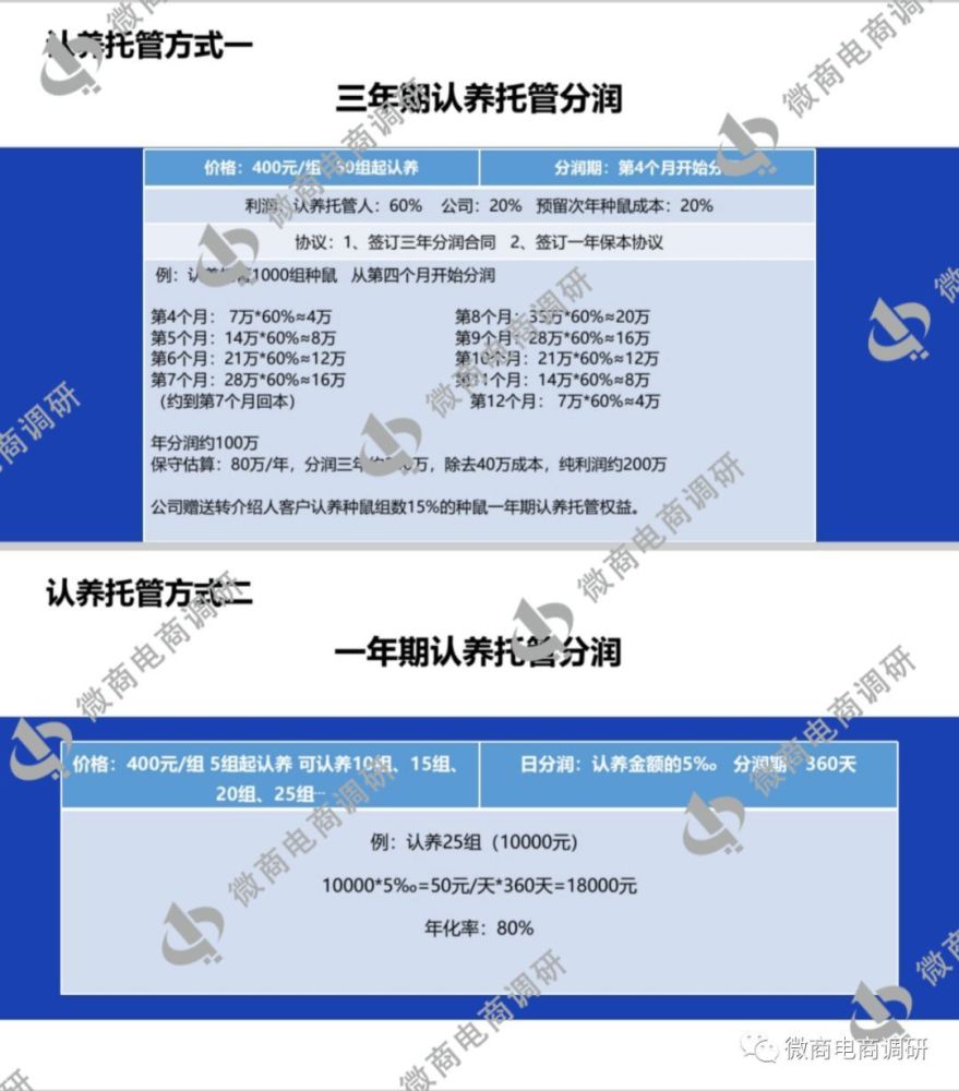 相信读者朋友也发现了,这种模式和“鼠多多”的3年期认养托管模式极为相似。最后,微商电商调研郑重提醒大家,投资需谨慎,高额的回报必定面临巨大的风险,请大家提高警惕,以免受骗。