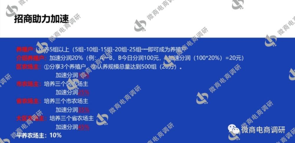 在这个招商助力加速模式中,有养殖户、区农场主、市农场主、省农场主和大区农场主5个等级。认养5组以上的小白鼠即可成为养殖户,养殖户介绍一个1年期的养殖户可以获得其日分润金额20%的加速分润,介绍一个3年期的养殖户可以获得其认养金额15%的种鼠奖励。