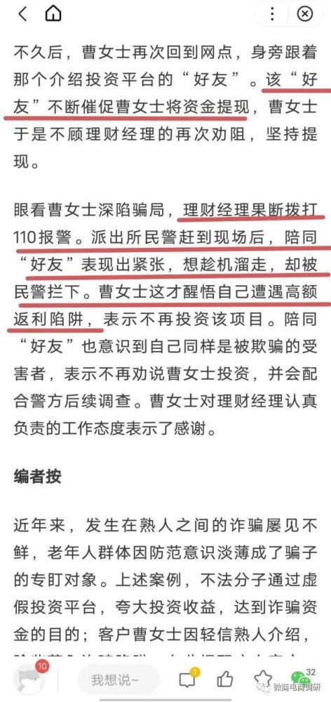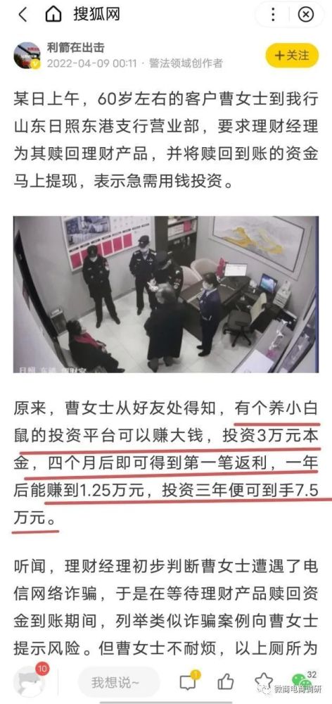 一位曹女士要将理财产品赎回提现,用来投资好友介绍的小白鼠养殖项目,投资3万元本金,4个月后即可得到第一笔返利,一年后能赚1.25万元三年便可到手7.5万元。理财经理认为曹女士遭遇了网络诈骗,便向曹女士提示了风险,可曹女士不予理会,坚持要提现投资,其好友也在旁不断催促。眼看曹女士深陷骗局,理财经理果断报警,民警到场后其好友表现出紧张,想趁机溜走,却被民警拦下,曹女士这才意识到自己遭遇了高额返利陷阱。