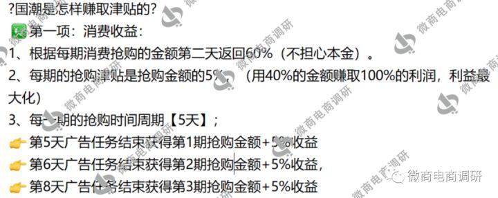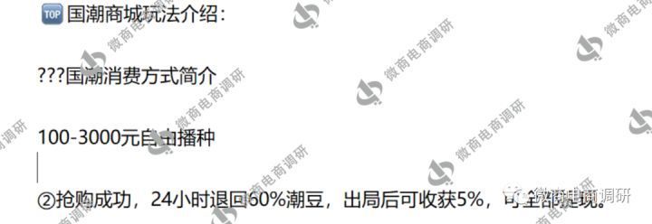 据经销商发来的资料显示,国潮商城的消费方式是需投资100-3000元,即可参与抢单,抢购成功,24小时退回60%潮豆,出局后可收获5%,可全部提现。