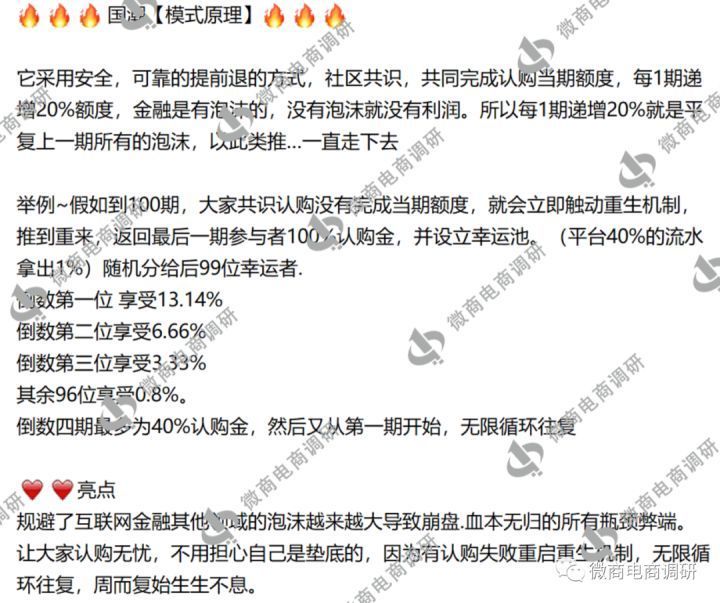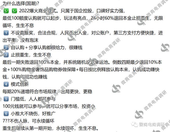 近几年,个别企业为了追求更好的招商效果,打着助农,央企,国企还有民族品牌等噱头,过度营销,夸大宣传。国潮商城以消费增值积分返利吸引消费者加入,实际上是存在很高的风险。有业内人士也曾指出:“某些返利盘一天返多少,一个星期返多少,违背金钱的流通性规律,当进场量不够支撑提现出口量的时候,资金链就会断裂,崩盘。”至于以“助力乡村振兴,国货崛起”的国潮商城会如何发展?商城产品与其他平台的产品价格差距巨大,是否对消费者来说是一种欺骗呢?对此,微商电商调研将继续保持关注。