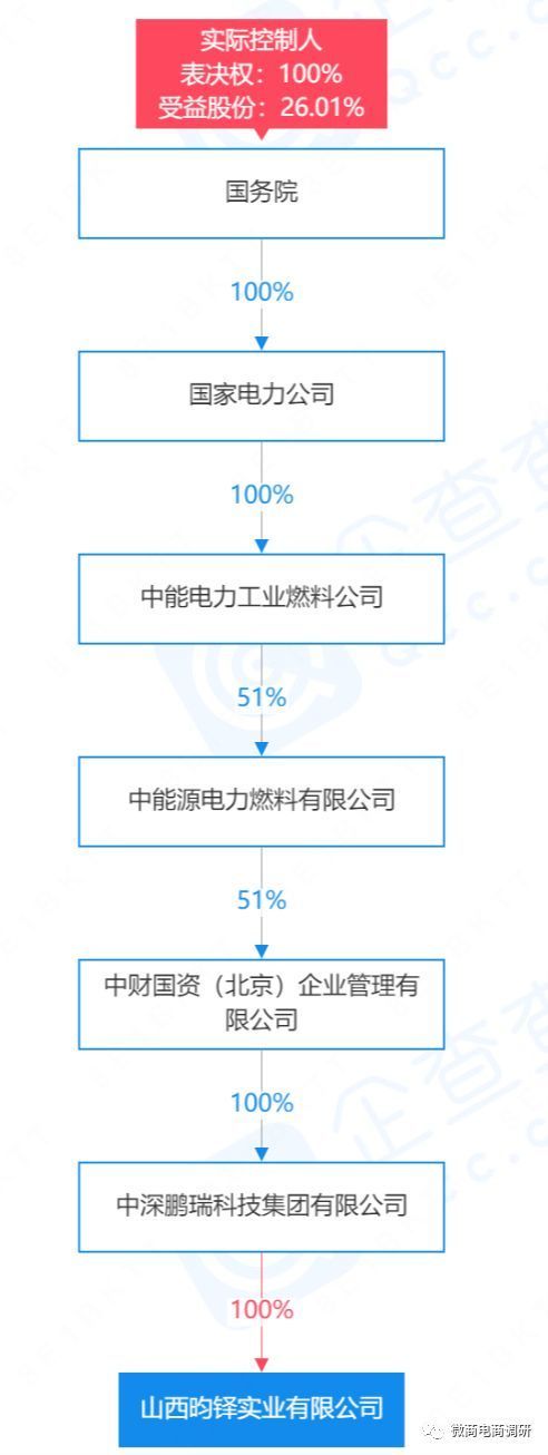 据企查查显示,山西昀铎实业有限公司成立于2022年4月12日,法定代表人为蒋依甜,经营范围包含煤炭及制品销售;非金属矿及制品销售及金属材料销售等。公司股东为中深鹏瑞科技集团有限公司,持股100%。中深鹏瑞科技集团有限公司的股东是中财国资(北京)企业管理有限公司,中财国资(北京)企业管理有限公司的股东是国家电力公司,国家电力公司隶属国资委。