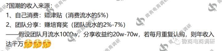 国潮经销商发来的资料显示,国潮代理商的收入是还可通过自己消费和团队之间分享来赚取收入的。