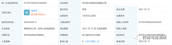 但是,据经销商介绍国潮商城的运营中心在杭州,成立了杭州沥川网络科技有限公司。据企查查显示,杭州沥川网络科技有限公司成立于2021年7月21日,法定代表人为吴苏珠,注册资本为100万,实缴资本0元,参保人数为0人,股东是吴苏珠,持股99%,还有一个股东是于朋,持股1%。