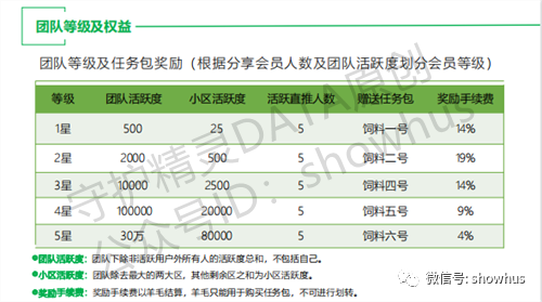 四星:团队活跃度100000,小区活跃度20000,活跃直推人数5。