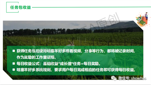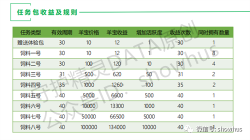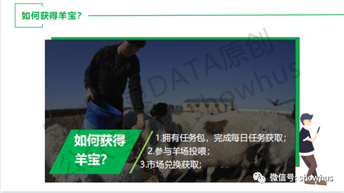 根据守护精灵DATA(ID:showhus)编辑部从市场推广人员小杨获得的《玩法介绍》PPT文档显示,羊宝/积分的获取方式有三种:拥有任务包(也就是卷轴),完成每日任务获取;参与羊场投喂;市场兑换获取。
