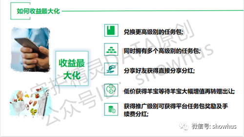 就像哇塞羊好多所提倡的“卷轴模式”,通过投入羊宝/羊毛来兑换任务包(卷轴),通过不断的获得任务包(复投)来获得额外的羊宝奖励,同时发展下线获得额外的推广收益。